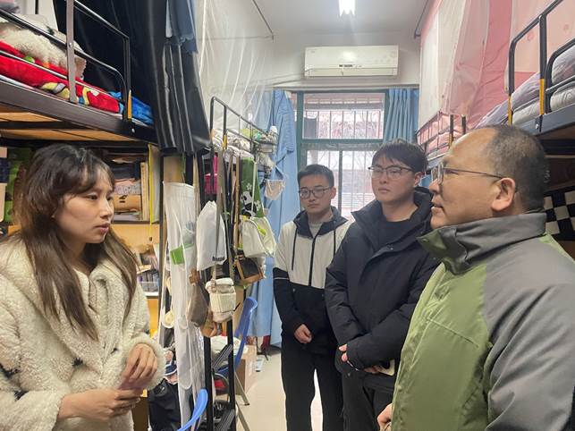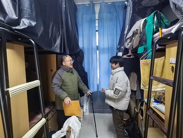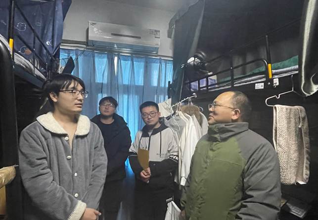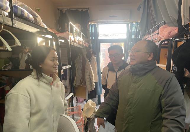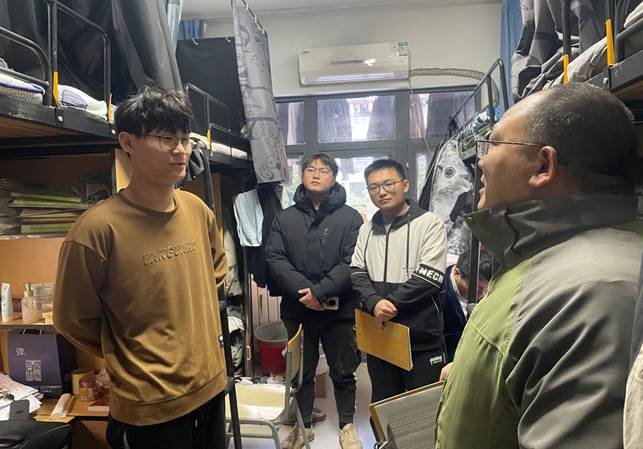 期间,检查组全体成员对研究生宿舍逐个楼宇逐个宿舍进行检查走访,重点查看宿舍卫生状况、是否存在违章电器等安全隐患,并询问学生是否已确定寒假离校时间、留校学生寒假期间的学习计划及未来发展规划,针对毕业年级学生详细了解其毕业论文写作进度及其找工作的进展情况。杨政军老师提醒同学们在日常生活中要相互体谅&相互关爱,在学习上要厚植家国情怀,崇德尚学,学有所成,报效国家;要常态化做好宿舍清洁卫生,坚持宿舍每天通风以保持室内空气清新;要强化安全意识,提升安全防范能力,严禁在宿舍存放与使用违章电器,严禁私拉电线网线,严禁在宿舍内给电动车电池充电,严禁在宿舍内抽烟,养成离开宿舍断电关水的良好习惯,室内及阳台杂物要及时进行清理,全力确保宿舍安全。杨政军老师还提醒同学们,如果在学习生活中遇到困难和问题,欢迎大家在第一时间向辅导员老师及时反映,只要是关乎学生学习生活等方面的合理诉求,学院都会竭尽全力帮助协调解决。最后,杨老师祝愿全体同学离校返乡途中一路顺风,并请同学们转达学院领导老师对其家人的亲切问候及春节美好祝福。