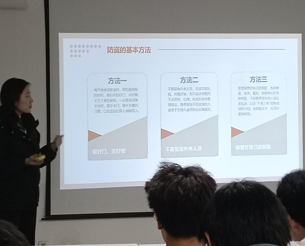 活动开篇,宣讲团队以“30秒逃生挑战”提问引发全场思考,随后播放的违规使用热得快致宿舍短路冒烟的模拟视频,迅速聚焦全场注意力。宣讲中,团队成员结合真实案例开展警示教育,详细通报校内违规电器使用、私拉电线网线等安全隐患查处情况,重点剖析某高校宿舍手机充电爆炸引燃被褥致万元损失的典型案例,让学生深刻认识到安全隐患并非“他人之事”,而是潜藏于日常起居的现实威胁。在此基础上,宣讲成员围绕消防安全、用电安全、财产安全、卫生环境四大核心板块系统讲解,助力学生全面掌握宿舍安全关键要点。