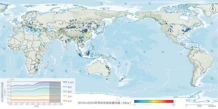 该项研究工作基于2015—2021年全球温室气体观测卫星(Greenhouse Gases Observing Satellite,GOSAT)和2019—2023年全球TROPOMI 的甲烷柱浓度数据,使用我校秦凯教授和Jason Cohen教授共同领导的“碳排放与空气质量遥感”团队提出的非模型依赖质量守恒排放反演模型,并结合全球煤矿相关数据,进一步估算了煤矿相关的甲烷排放量。该工作揭示了2015—2024年,全球煤炭主产区煤矿甲烷总排放量增长约6%,中国产区单位原煤甲烷排放量下降17%(图2)。该工作融合了“碳排放与空气质量遥感”团队正在承担的联合国环境规划署甲烷研究项目的最新研究成果。