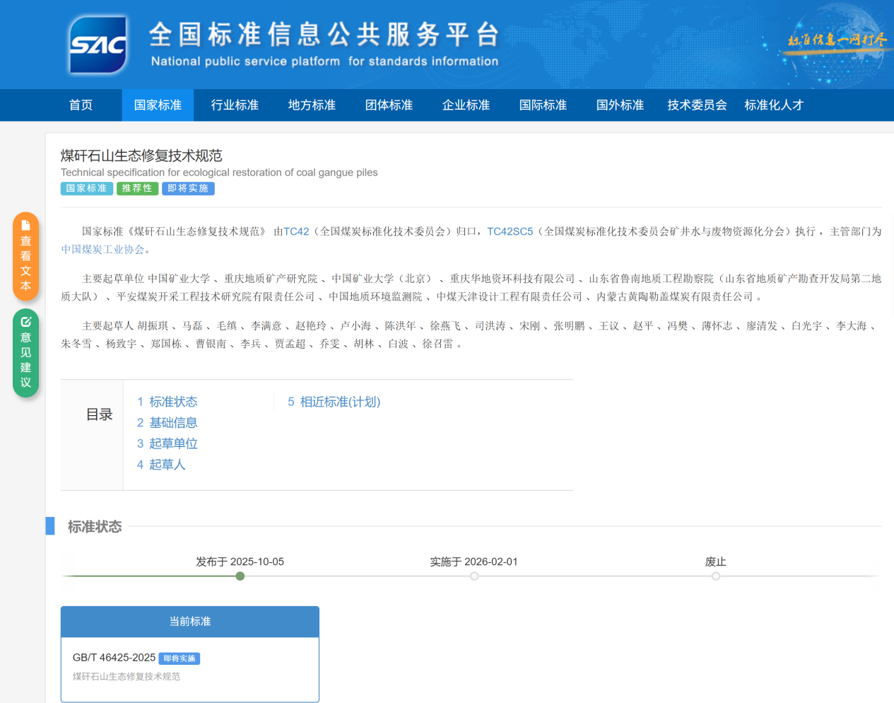 《煤矸石山生态修复技术规范》国家标准(GB/T46425-2025)确立了煤矸石山生态修复的总体原则、工作流程、调查评价、生态修复工程设计、主要技术要求、监测与管护等全链条技术措施的相关要求。《酸性煤矸石山治理技术规程》(MT/T 1272-2025)针对环境影响较大的酸性煤矸石山提出了治理流程、基本情况调查、治理方案编制、立地条件整治、灭火方法、防火方法、植被重建、治理验收与监测等方面的技术要求,为酸性煤矸石山治理提供了统一技术规范。这两项标准相互配合,为不同类型、不同排矸阶段、不同地形的煤矸石山综合治理工程提供了参照依据。这两项标准的出台,将有效解决长期存在的治理技术不规范、治理效果参差不齐等问题,推动煤矸石山生态修复标准化、规范化发展。
