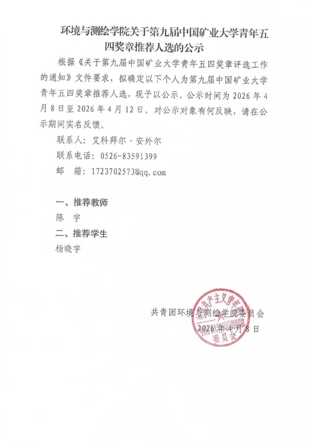 环境与测绘学院关于第九届中国矿业大学青年五四奖章推荐人选的公示
